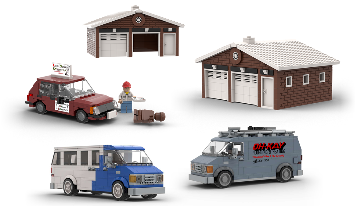 Das Haus an sich gibt es vom bekannten dänischen Hersteller bereits als Bausatz. Als Ergänzung biete ich die Garage sowie die Vans vom "Airport Express" als auch den Van der beiden "feuchten Banditen" und das Pizza Taxi von "Little Nero's" an.